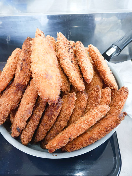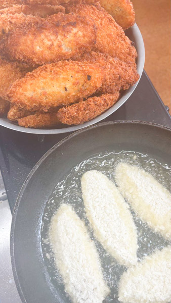 丁寧に揚げた白身魚のフライに、ちらし寿司用のたまご焼きも準備。